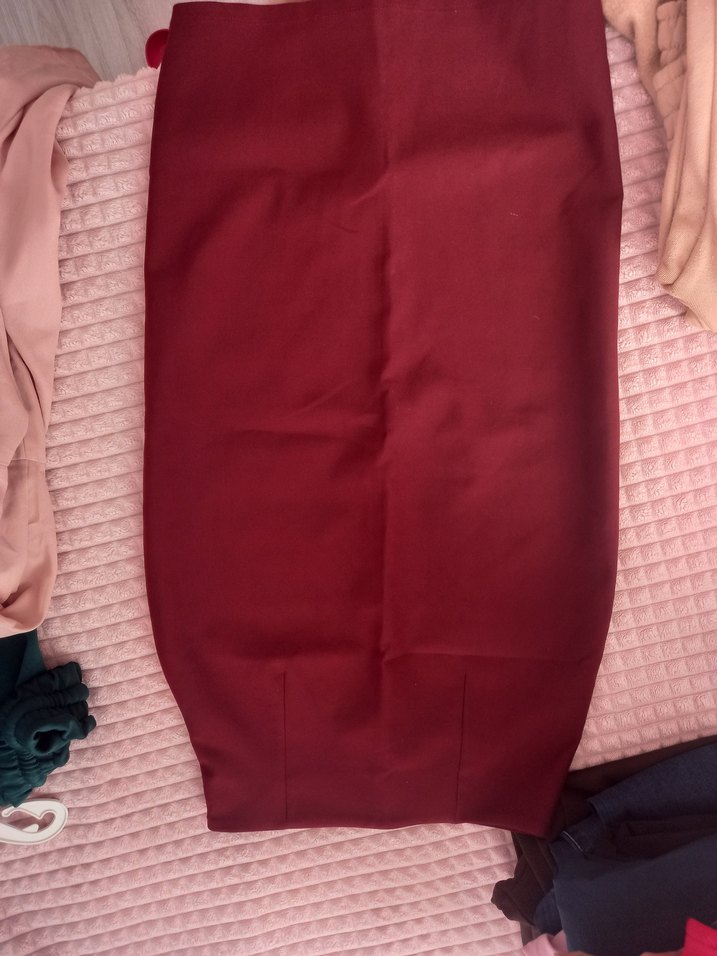 Bordo renkli hamile eteği, dar kesim ve pilili detaylarla midi boyda, sentetik kumaştan üretilmiştir. Minimalist ve sade tarzda, romantik buluşmalar için uygundur.