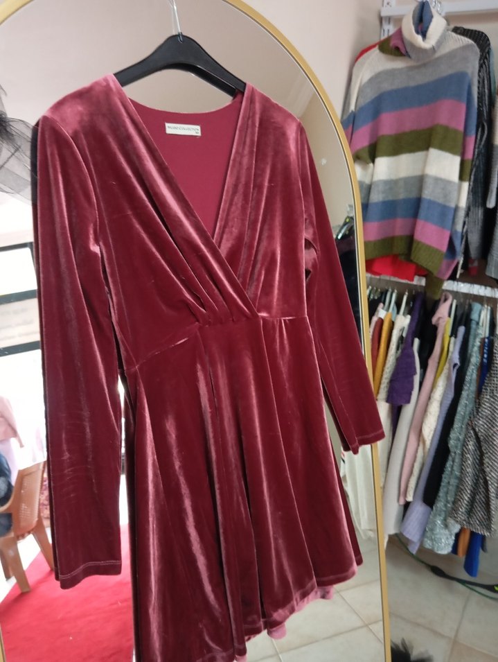 Bordo midi uzunlukta, drapeli V yakalı, uzun kollu, bol kesim ve parlak desenli abiye elbisedir. Parti için çağdaş ve rahat bir tarz sunar.✨