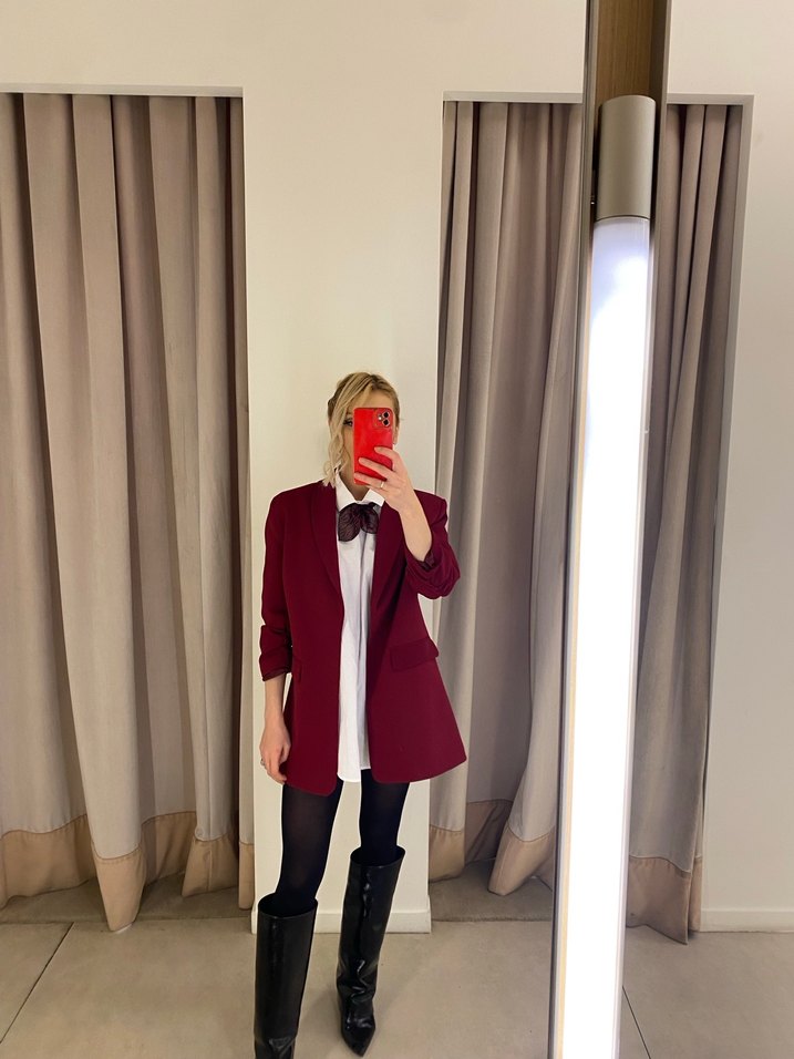 Bordo midi uzunlukta kadın blazer ceket, kesik yaka, uzun kollu ve normal kesimdir. Düz sentetik kumaştan yapılmış, ofis ve şık gündelik tarz için zahmetsiz şıklık sunar. Desensiz tasarımı normcore stiline uygundur.