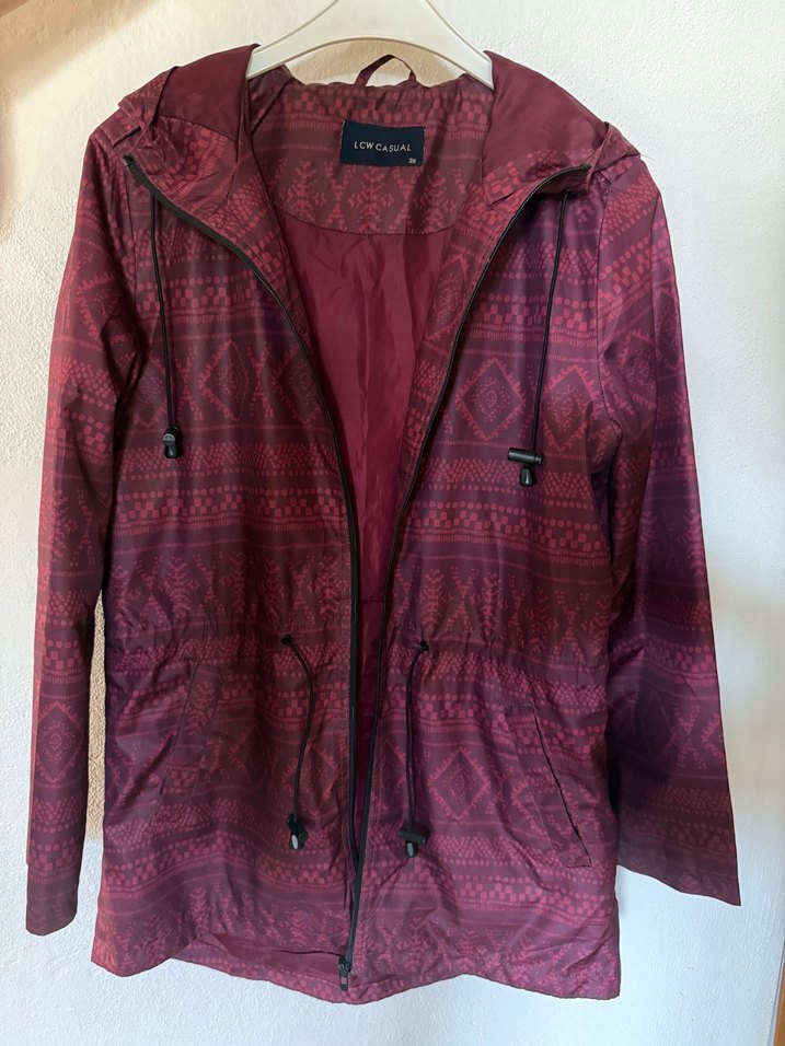 Bordo renkte, bohem desenli, sentetik kumaştan yapılmış, fermuarlı ve notched yakalı, uzun kollu, bol kesim midi kadın ceket.