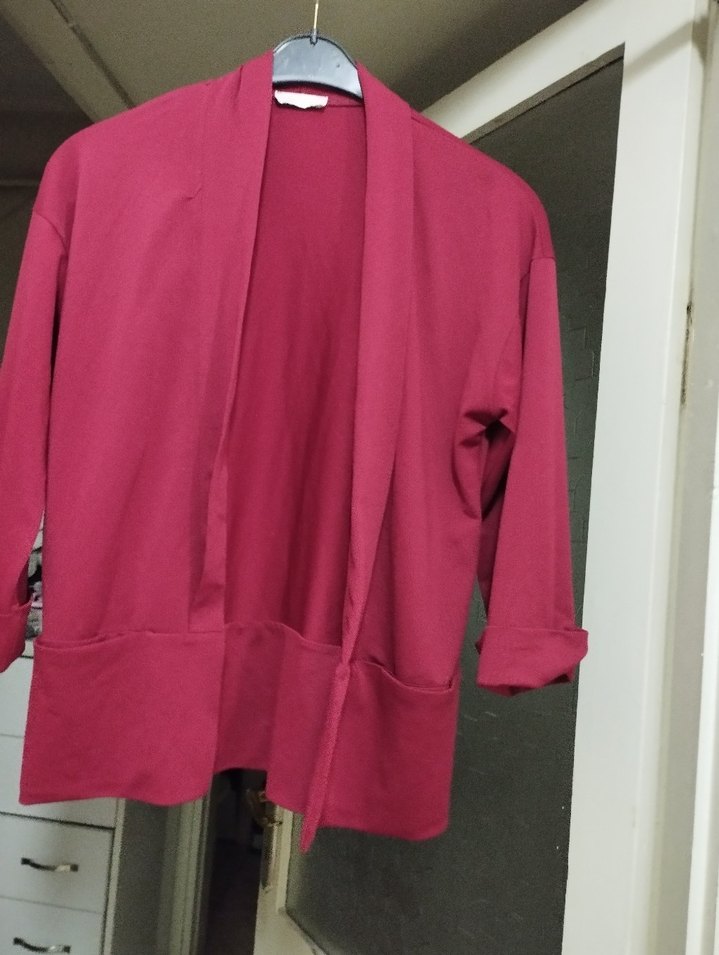 Bordo midi uzunlukta, yaka detaylı ve bol kesim kadın ceket Uzun kollu, dökümlü tasarımı yumuşak ve sıcak dokudan yapılmıştır.