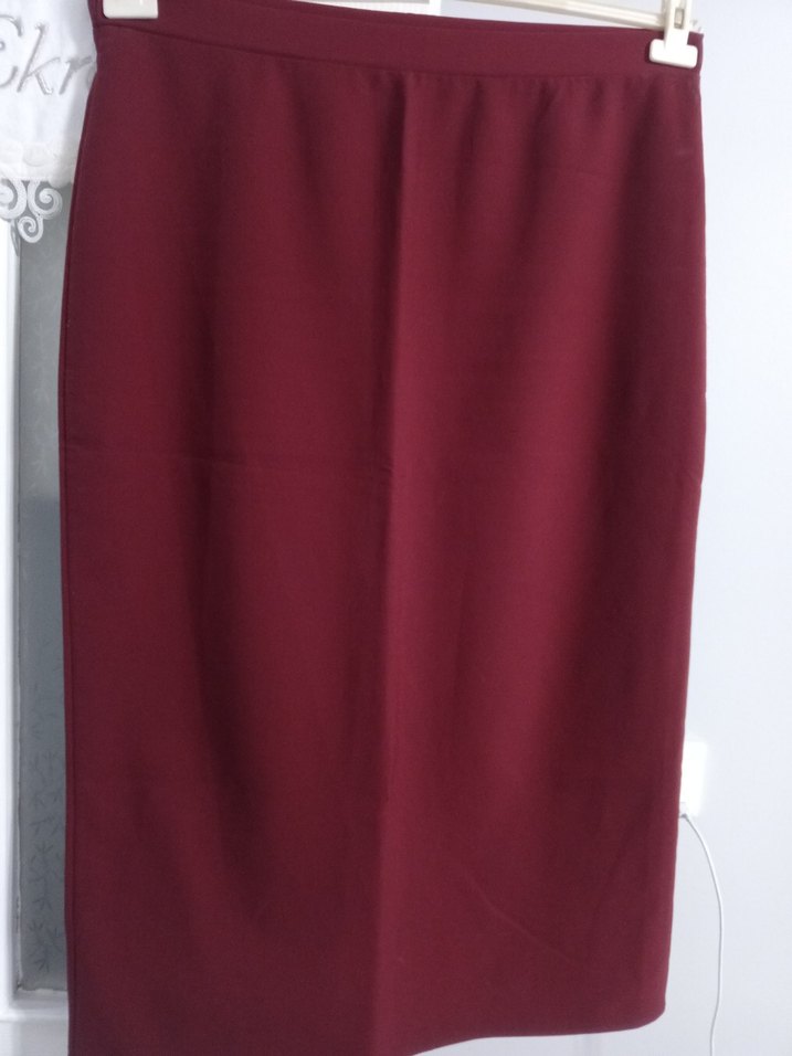 Bordo midi uzunluğunda, drapeli tasarıma sahip, düz ve desen içermeyen kadın eteği. Sentetik kumaştan, ofis ve iş ortamları için uygundur.