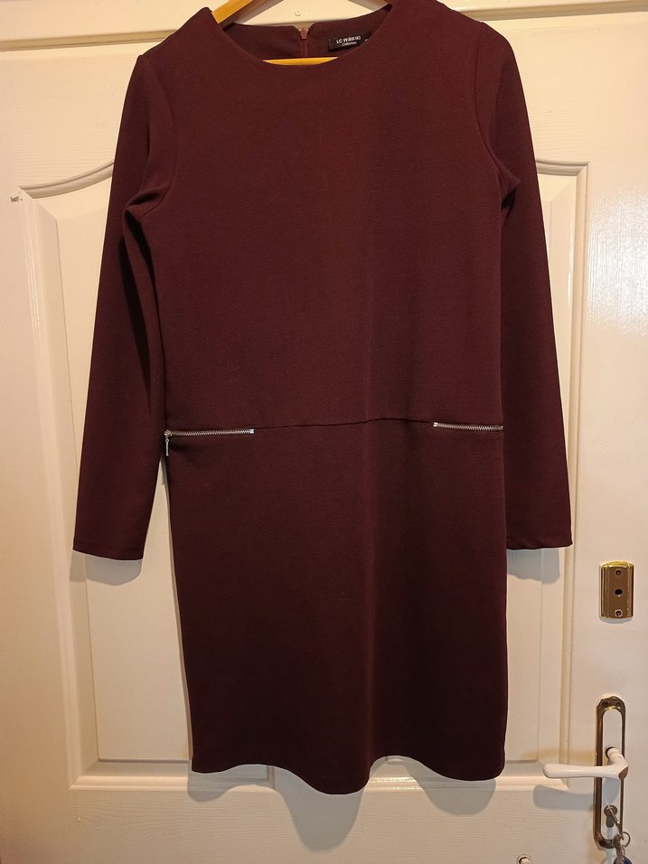 Bordo renk, uzun kollu, yuvarlak yakalı, fermuarlı detaylı, sentetik kumaştan yapılmış, ofis için uygun, vücuda oturan midi elbise.