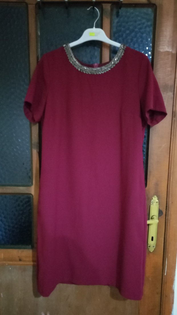 Bordo midi boy, kısa kollu, bol kesim elbise. Drapeli tasarım ve süslü yuvarlak yaka detayına sahip. Romantik akşamlar için uygun.