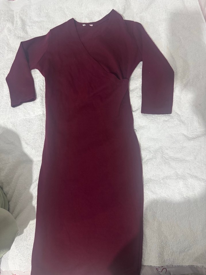 Bordo renkte, uzun kollu ve dar kesim midi boy kadın elbise. Minimalist ve desensiz tasarımıyla sokak stiline uygun.