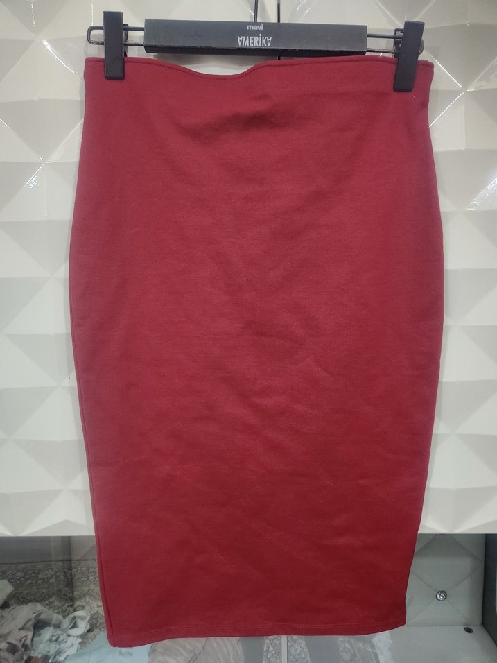 Bordo renk, vücuda oturan midi kalem etek, düz ve sentetik kumaştan, ofis ve minimalist sokak stiline uygun.