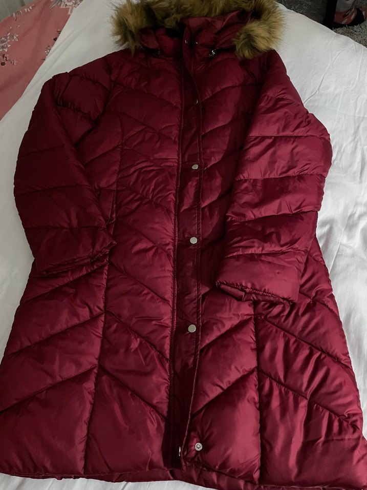Bordo midi uzunlukta, düğmeli, kapüşonlu ve sentetik kumaşlı kadın kışlık mont. Uzun kollu ve rahat sokak stili için uygun. ❄️