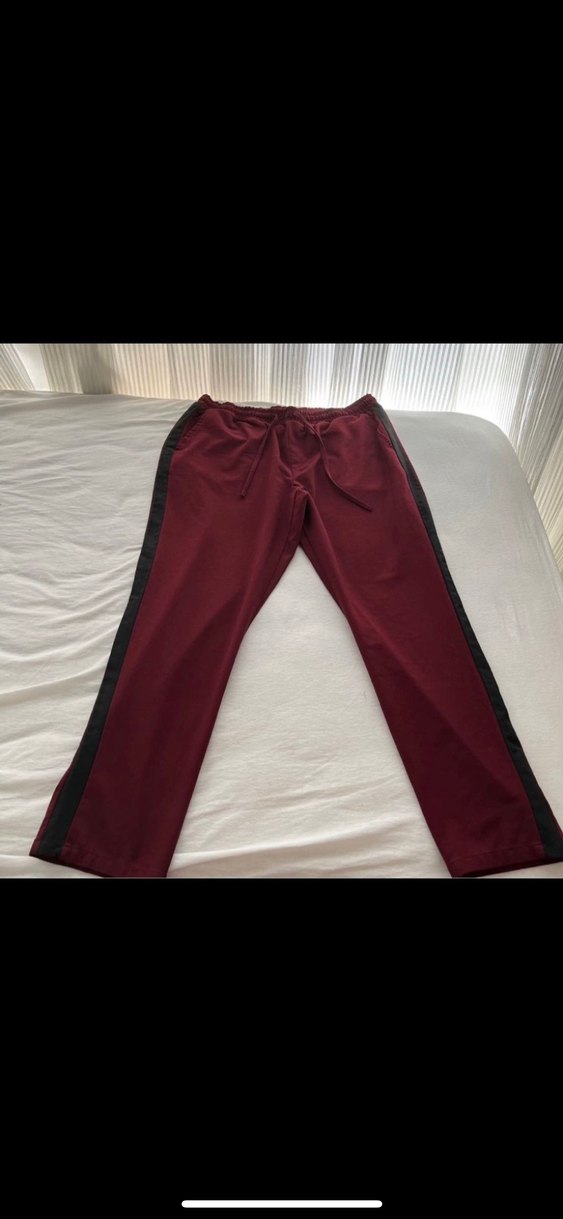 Bordo kumaştan, kemerli ve siyah yan şeritli midi uzunlukta kadın pantolon. Günlük sokak stili için rahat ve regular fit.