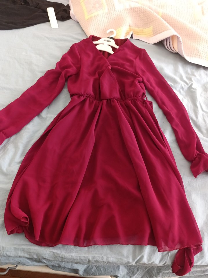 Bordo midi uzunlukta, bol kesim ve drapeli tasarıma sahip elbise. V yaka ve uzun kollu, parlak kumaşı romantik akşamlar için uygun.
