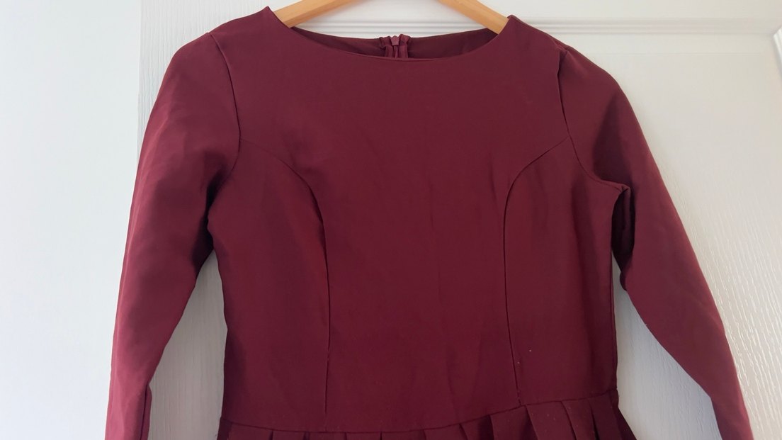 Bordo renkli, uzun kollu ve V yakalı, fermuarlı, modern klasik stilde, ofis için uygun dar kesim midi elbise.