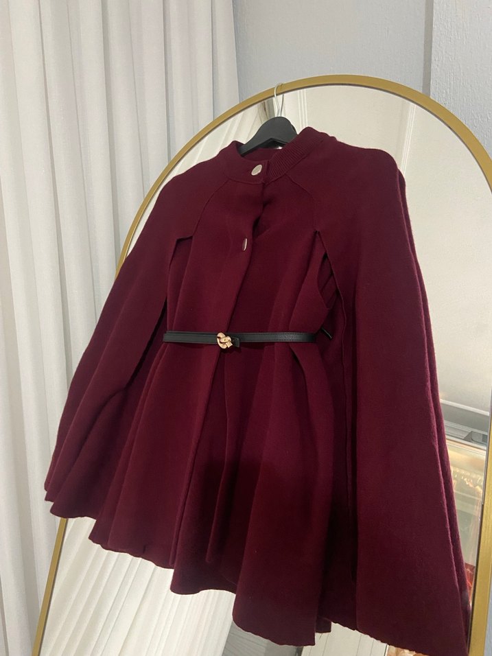 Bordo renkli, kemerli, notched lapel yakalı ve uzun kollu kadın pelerinidir. Rahat kesimli ve yumuşak, sıcak kumaştandır, ofis için uygundur.