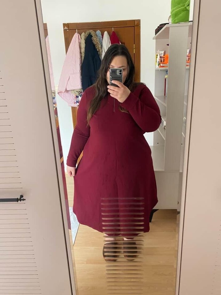 Bordo midi uzunlukta, bol kesim kadın triko elbise. Uzun kollu, yüksek yakalı ve fermuar detaylidir, jarse tarzı kumaştan üretilmiştir güzel üründür. Günlük kullanıma uygun, rahat ve şık bir tasarıma sahiptir. tesettür için uygundur