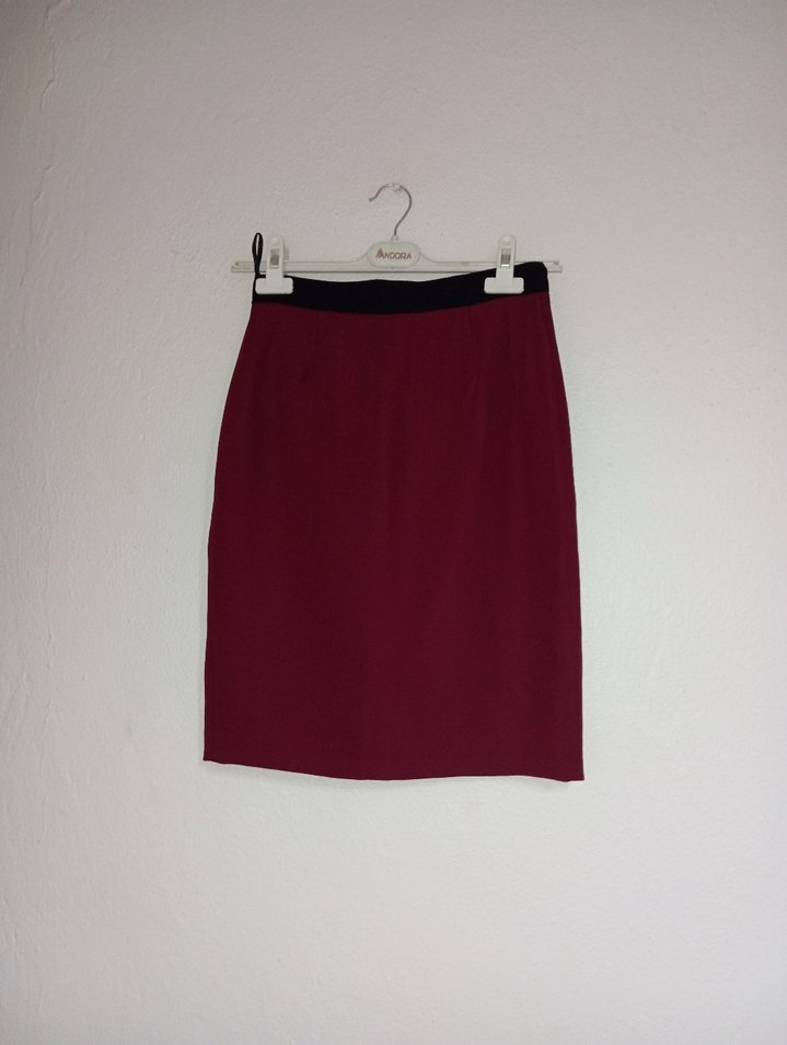 Bordo renkli, belden kemerli, saten dokulu, normal boy midi kalem etek. Ofis için uygun, minimalist tarzda şık bir parça.