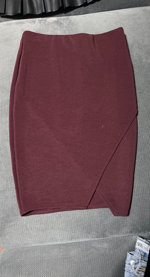 Bordo renkli, yırtmaç detaylı, vücuda oturan midi kalem etek. Düz ve sade tasarımlı, rahat sentetik kumaştan üretilmiştir.