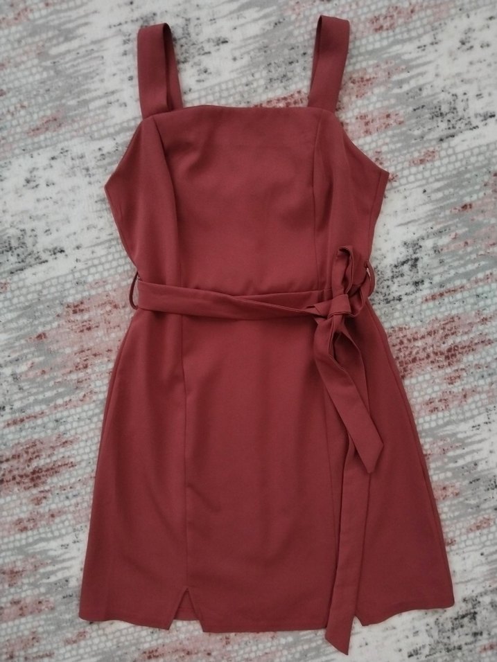 Bordo renkli, kemerli ve askılı midi boy kadın elbise. Düz, sentetik kumaştan olup, günlük kullanım için uygundur. Arkası fermuarlıdır elbise boyu 87 cm, iki koltuk altı arası mesafe 40 cm'dir