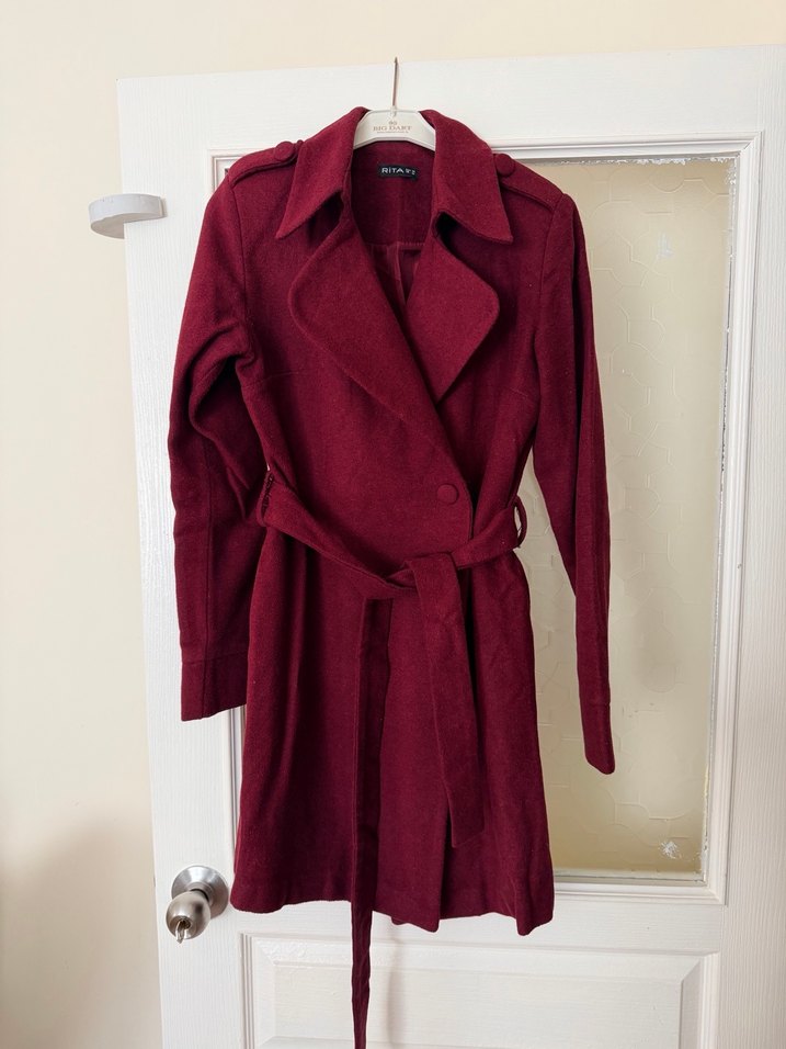 M beden yazıyor ama S ile uyumlu bence ben 50 kiloyken giymiştim Bordo renkte, kemerli ve normal boy midi kaban. Uzun kollu, yumuşak ve sıcak kumaştan, ofis kullanımı için uygun.