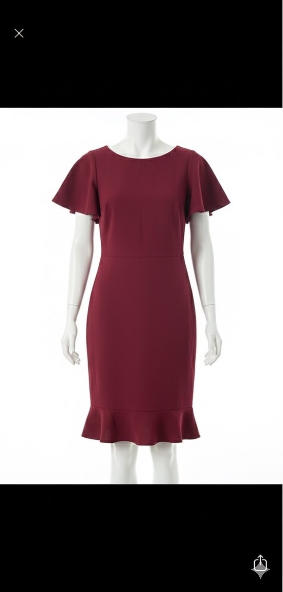 Bordo midi boy, kısa kollu, yuvarlak yakalı, fırfırlı etek ucu ve kollara sahip klasik ve minimal şık elbise.