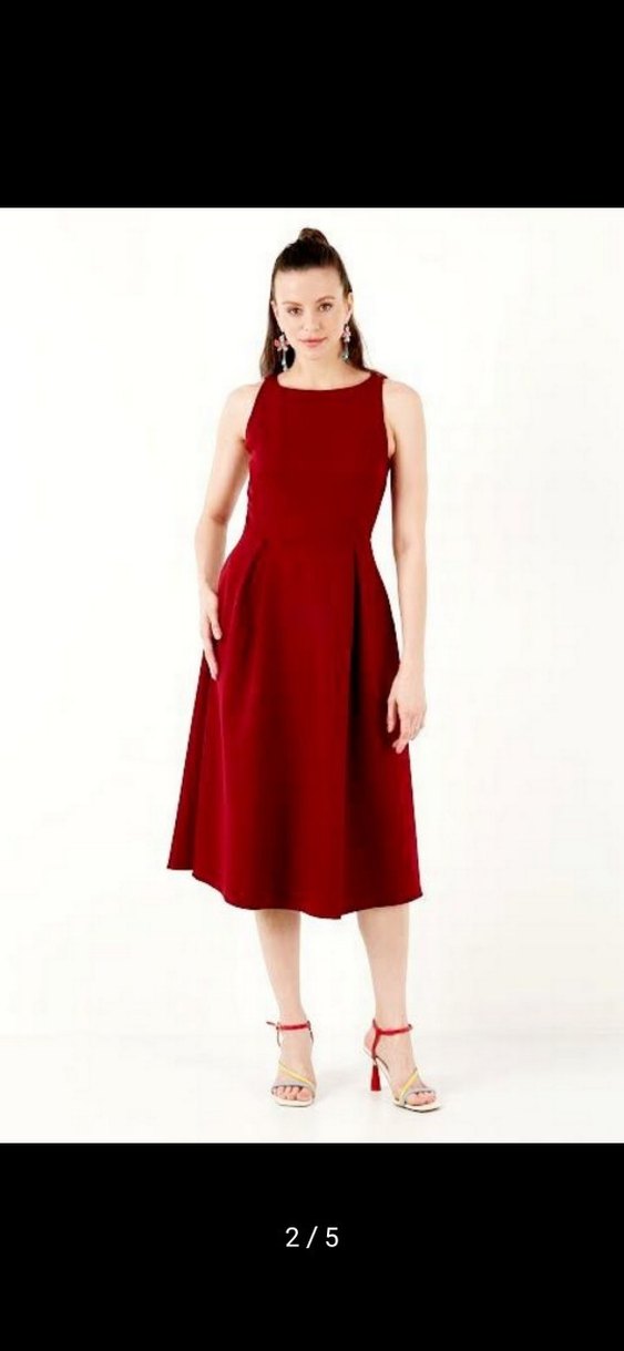 Bordo, parlak sentetik kumaştan kolsuz midi elbise. Tekne yaka ve bol kesimiyle romantik buluşmalar için modern klasik şıklık sunar. ✨