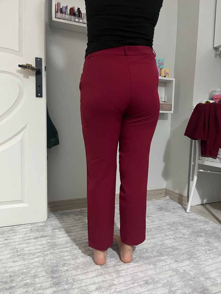 Bordo midi boy, düzenli kesim kadın pantolon, yumuşak sentetik kumaştan olup ofis için şık ve rahat bir görünüm sunar.