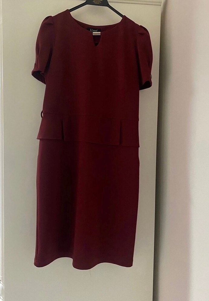 1 defa kullanıldı. Bordo midi elbise, kısa kollu, V yaka ve kemerli bel detayına sahiptir. Modern klasik tarzda, ofis için uygundur. Düz ve sade tasarıma sahiptir.