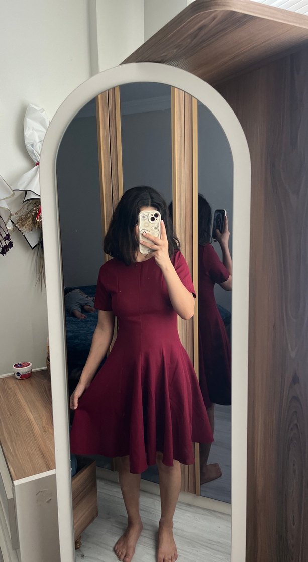 Bordo renk, oval yaka ve kısa kollu, ince kesimli midi elbise. İpeksi dokusu ve sade tasarımıyla romantik akşamlar için uygun, zahmetsiz şıklık sunar.
