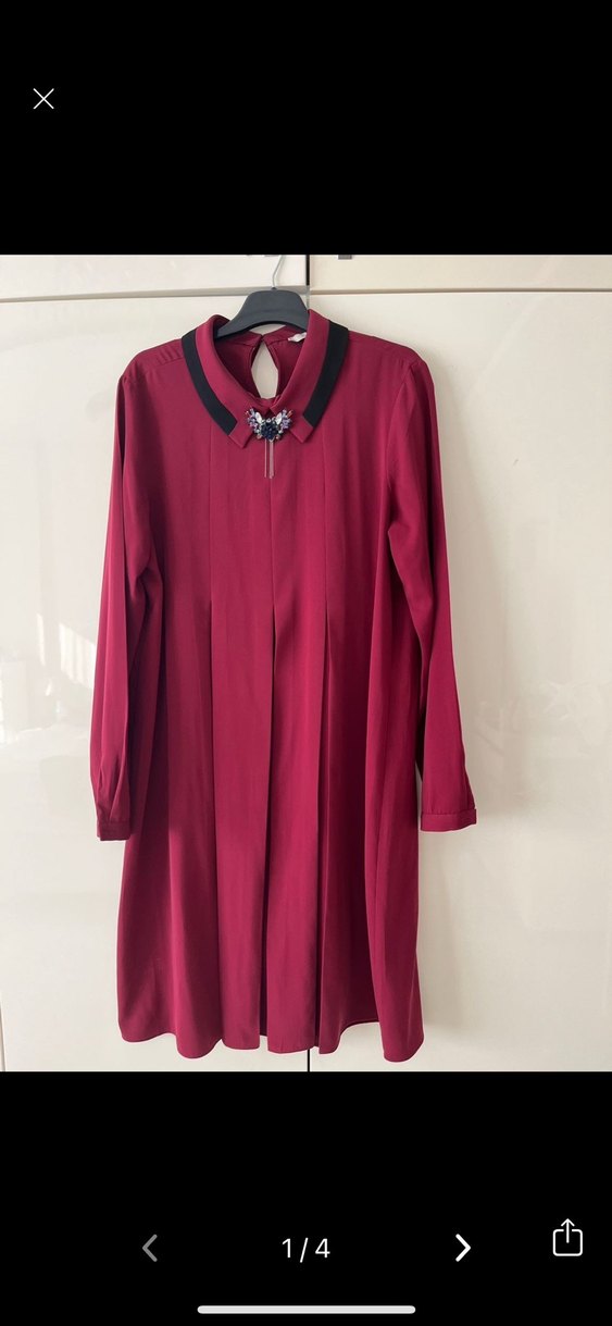 Bordo midi tunik, yaka detayı ve broş süslemeli. Uzun kollu, piliseli ve bol kesim. Ofis için şık ve rahat, ipeksi dokuda.