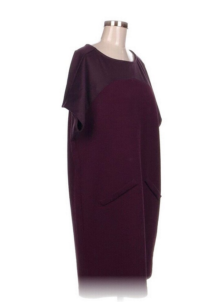 Musiki marka, L beden. Bordo midi boy, salaş kesim kadın elbise. Kısa kollu, yuvarlak yaka ve ipeksi dokusuyla ofis için zarif ve minimal bir şıklık sunar. Göğüs 62 cm, uzunluğu 94 cm.