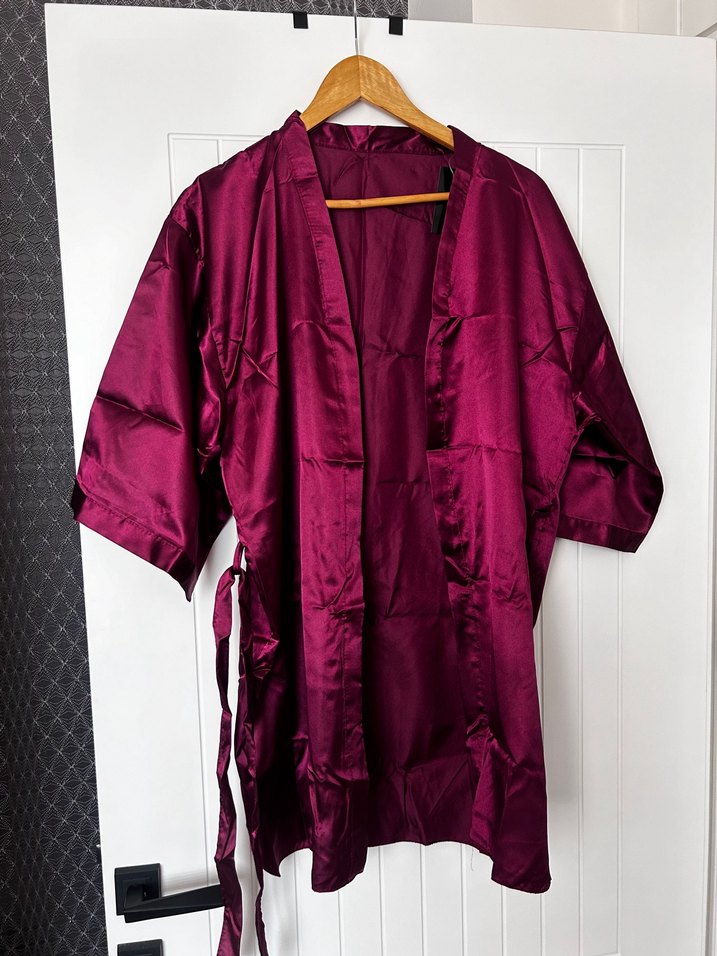 Bordo midi uzunlukta, bol kesim ve askılı kollara sahip parlak saten kumaştan minimalist bohem tarzında kadın sabahlık. Belden bağlamalı ve desensiz.
