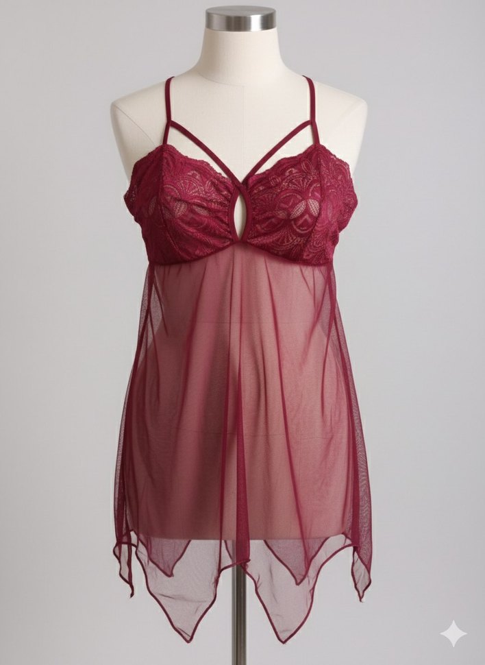 Bordo renk, ince askılı, dantel detaylı ve transparan kumaştan midi uzunlukta minimal ve modern görünümlü gecelik.