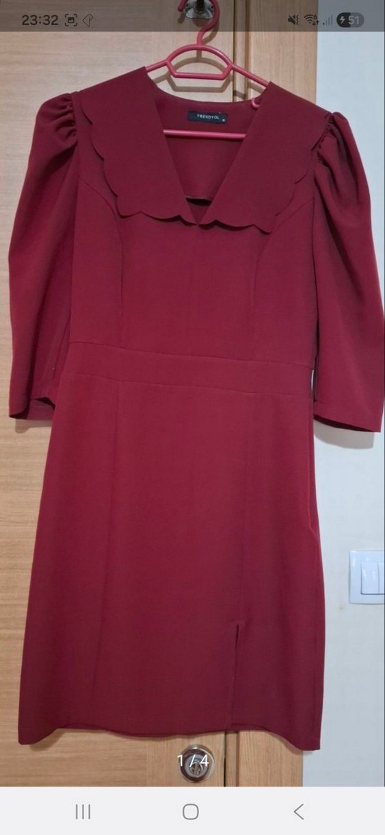Bordo renkte, V yaka ve fırfırlı detaylı, uzun kollu, vücuda oturan midi elbise. Ofis için uygun, sentetik kumaştan yapılmıştır.