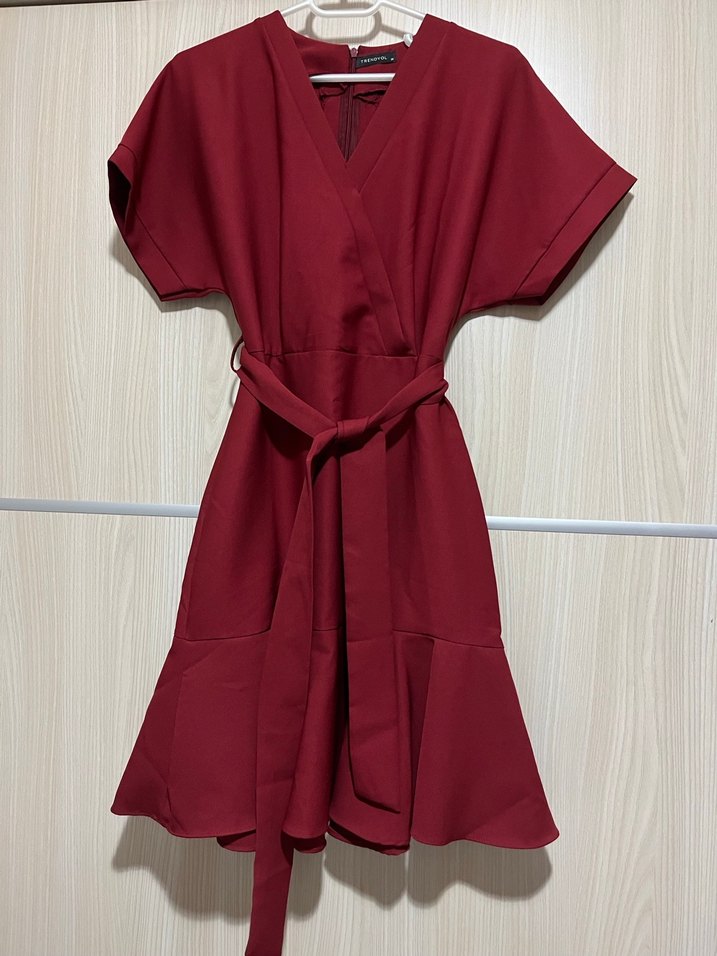 Bordo midi elbise, V yaka ve kısa kollu, salaş kesim ve kuşaklı. Dökümlü tasarımı ve sade görünümü ile ofis için uygundur.