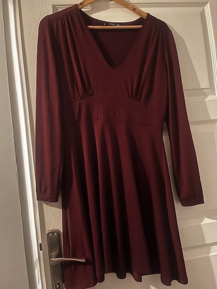 Bordo midi elbise, V yaka ve uzun kollu, drapeli tasarımıyla romantik akşamlar için klasik ve gotik tarzda rahat bir kesim sunar.