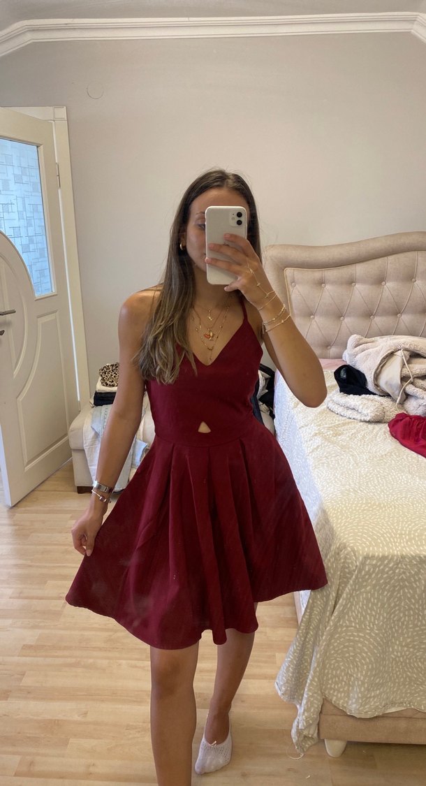 Bordo Midi V Yakalı İnce Askılı Elbise