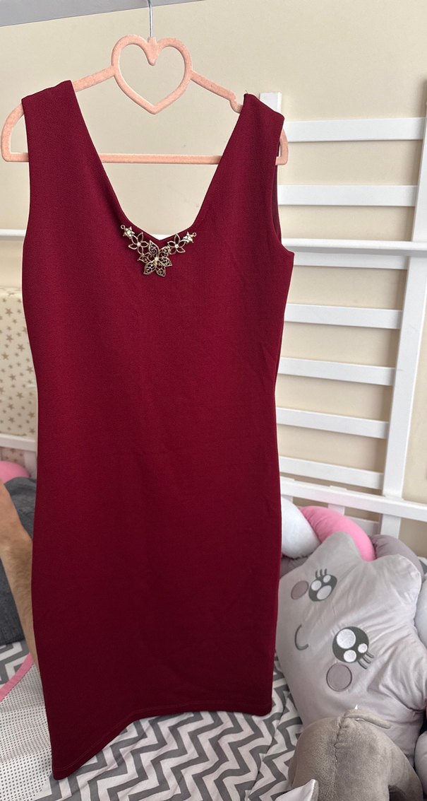Bordo midi boy, v yakalı ve kolsuz, payet detaylı şık kadın elbisesi. Romantik buluşmalar için uygundur. ✨