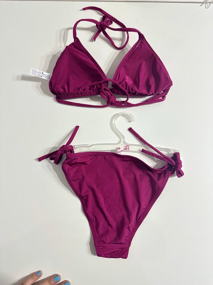 Bordo renkli, ince askılı ve kısa kesimli bu bikini takımı, minimalist bohem tarzıyla sahilde şıklık sunar.