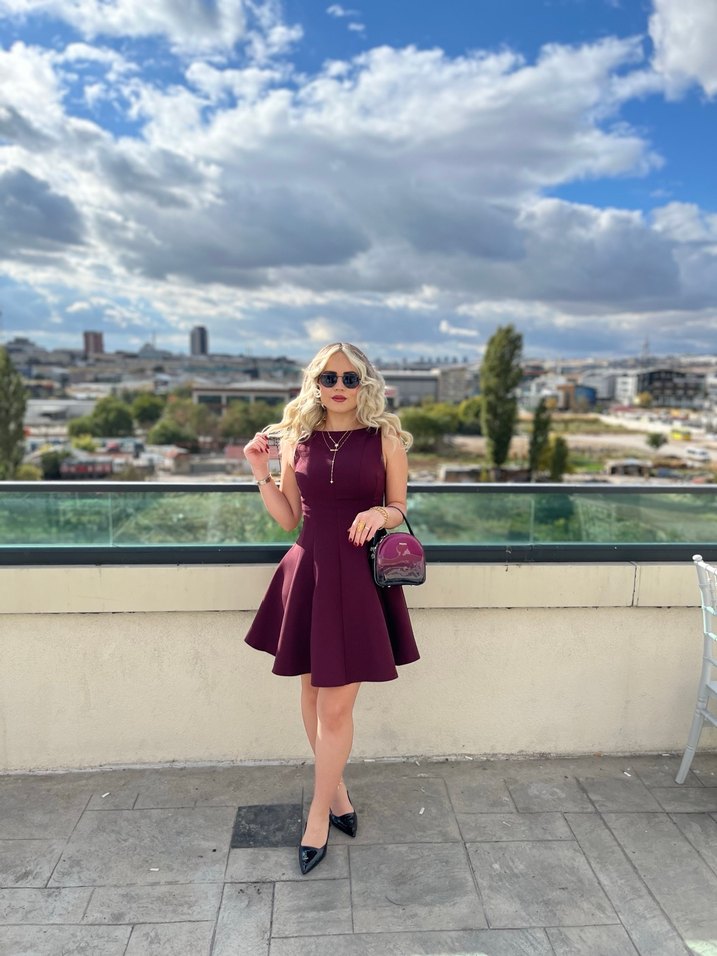Bordo renkli, sıfır kol ve kabarık detaylı, dabıl kumaştan yapılmış, vücuda oturan mini boy elbise. Trendy gündelik sokak stili için uygundur, romantik akşamlar için ideal. Sadece 1 kez düğün için kullanıldı yeni alınmış bir elbisedir .