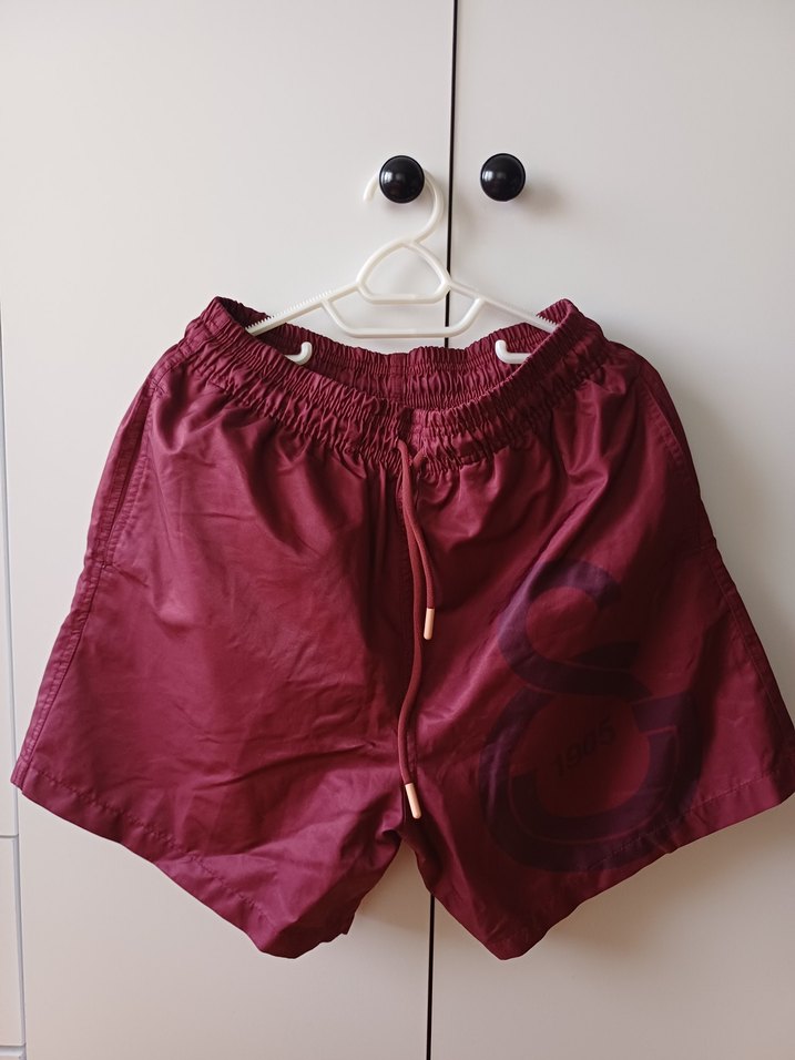 Bordo renkli, bol kesim erkek deniz şortu. Elastik bel ve bağcıklı, parlak yüzeyli rahat bir plaj şıklığı sunar.