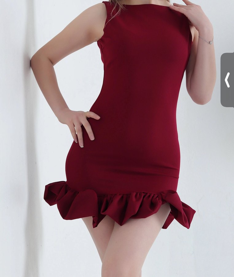 Bordo renkli, straplez yaka ve fırfırlı etek ucu detaylı, vücuda oturan mini elbisedir. Pürüzsüz sentetik kumaştan üretilmiştir.