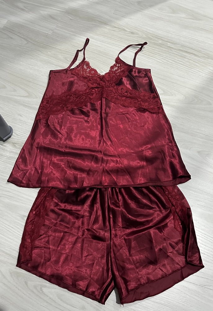 Bordo renkli kadın pijama takımı, mini boy ve ip askılı üst kısmıyla bol kesimdir. Yumuşak ve pürüzsüz kumaştan, bohem dantel detaylarla rahat ve şık bir uyku deneyimi sunar.