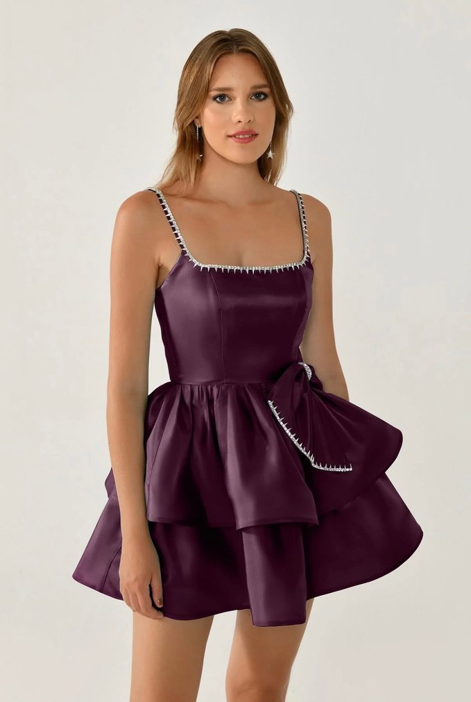 Bordo mini elbise, askılı ve işlemeli fırfır detaylıdır. Parlak kumaşı ve modern kesimiyle düğünler için uygundur.