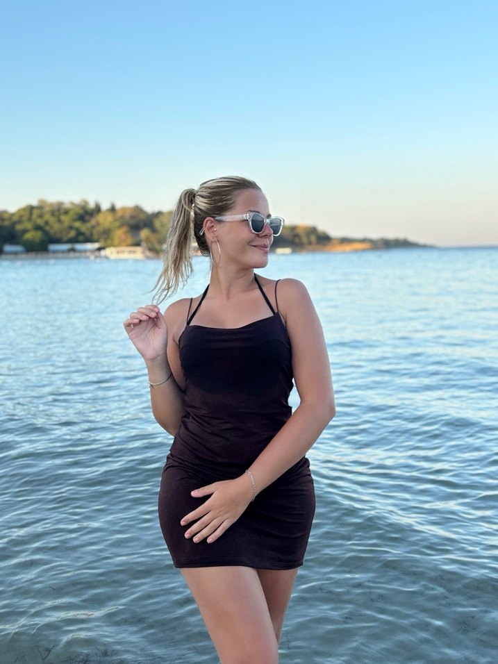 Bordo mini, ince askılı sade tasarımlı bu dar kesim elbise, plajda ve günlük giyimde zahmetsiz şıklık sunar.