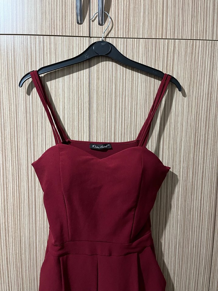 Bordo renkli, V yaka ve ince askılı, vücuda oturan kısa tulum. Drapeli detaylı, sentetik kumaştan, günlük sokak stiline uygun. Üstte harika duran bir tulum kilo aldığım için satıyorum.