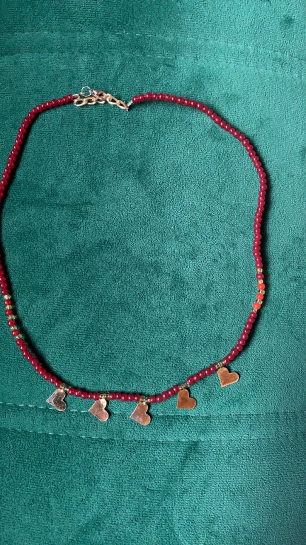Bordo renkte, kısa uzunlukta ve nakış detaylı, küçük kalp figürlü bohem kadın kolyesi. Günlük kullanım için uygundur. Kalplerde göründüğü gibi hafif yıpranma var
