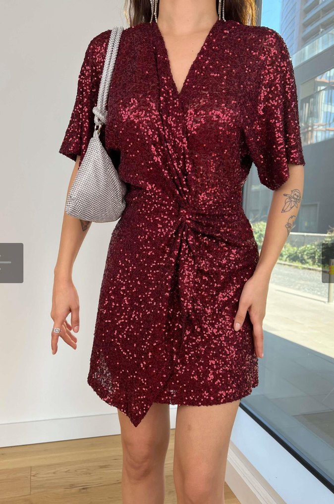 Bordo, kısa kollu ve V yakalı bu mini elbise, payetli ve parlak yılan desenli kumaşıyla dikkat çekiyor. Romantik akşamlar için uygundur. ✨