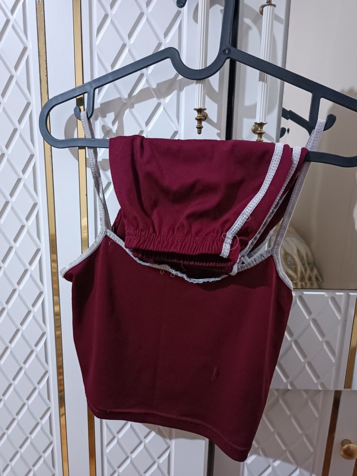 Bordo renkli, parlak ve desen içermeyen kısa mini atlet ve şort takımı, ince askılı ve spor tarzda tasarlanmıştır.