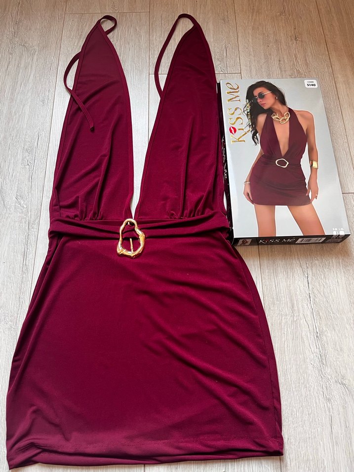 Derin V yaka ve ince askılı, saten parlak kumaştan bordo mini elbise. Belinde tokalı kemer bulunur, romantik ve göz alıcı bir gece için ideal. Bedenler için mesaj atınız