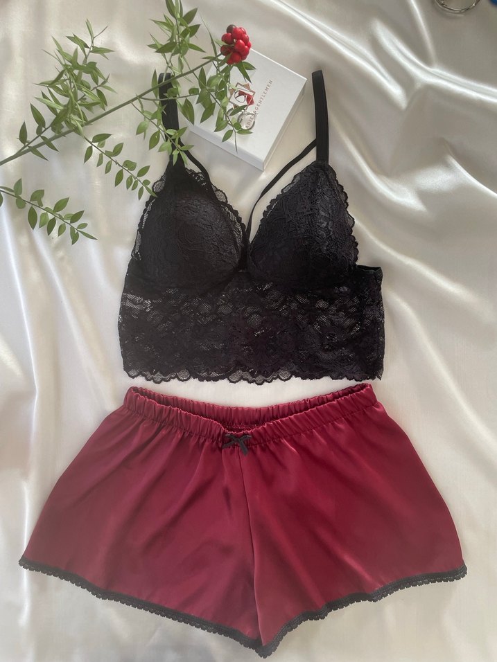 Kadınlar için bordo saten şort ve siyah dantel detaylı, askılı, vücuda oturan pijama takımı. Şort elastik bel bandına sahiptir. Farklı bedenleri var