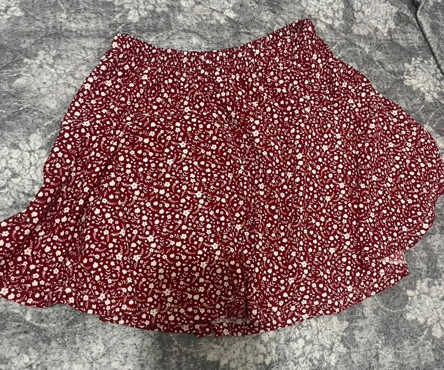 Bordo renkli, fırfırlı ve bol kesime sahip mini şort etek, yumuşak sentetik kumaştan üretilmiştir. Bohem tarzıyla açık hava etkinlikleri için uygundur.