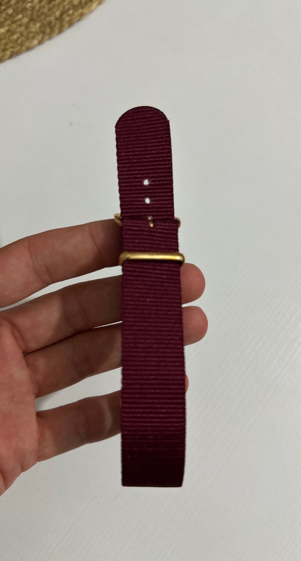 Minimalist tarzda, parlak bordo renkte erkek saat kayışı. Basit ve sade tasarımı ile günlük sokak giyimine uyum sağlar. Altın renkli aksesuarlar içerir. ⌚