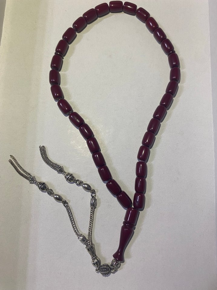 Bordo renkli, minimalist tarzda erkek tesbih. Gümüş detaylı püskülleriyle sade ve şık bir görünüm sunar.